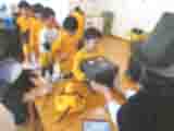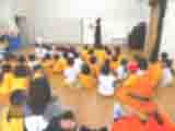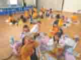 ぱんだ・きりん・らいおん組の子ども達が遠足をしました。お家の人に作ってもらったお弁当を自分のリュックに入れて、みんなとっても嬉しそうな笑顔で入ってきました。雨が降りそうな天気になってしまったので、中での遠足になりました。先生達は中でも楽しくできるように工夫を凝らしました。今日はハロウインの日でもありますので遠足はハロウイン色に染まりました。初めに「妖怪村のドッキリハロウイン」という絵本を読みました。それから縦割りでグループに分かれてクラスに作ったコーナーでスタンプラリーをしました。ぱんだ組の部屋では、クラスに隠されたお化けを探して何匹いるか数を当てます。きりん組の部屋ではフープを跳んでゴールを目指しました。らいおん組の部屋では、箱に入ったものを手探りで当てます。箱の中が分からないのでこわごわ慎重に手探りで触っていました。全部のクラスを回ったら、スタンプを集めたカードを持って遊戯室に戻ります。遊戯室では大きなお化けが待っていて、おやつのお菓子をもらいます。でも、おやつをもらうには「トリックオアトリート!お菓子くれなきゃいたずらしちゃうぞ。」とお化けに言わないといけません。いつもはとっても威勢の良いことを言っている子どもたちですが、大きなお化けの前ではおじけづいてしまったようですが、みんながんばってもらうことができました。それからクラスに戻って、楽しみにしていたお弁当です。お家の人に作ってもらったお弁当を前に、さっきまでのこわばった顔とは違って、みんな満面の笑顔で作ってもらったお弁当を自慢げに見せてくれました。お家の皆さんお弁当などご協力をありがとうございました。子ども達はお家に帰ったら遠足のお話をどんなふうに伝えるのでしょうね。よかったら教えてくださいね。