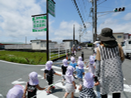 ひよこ組とりす組の子ども達が散歩に出かけました。今日は梅雨の晴れ間で、蒸し蒸しと暑さを感じる陽気でした。子ども達が向かったのは外城田川の方です。保育所横の道ではアスファルトからの照り返しが暑く堤防に付くまでにへたってしまいそうなくらいでした。小さな子ども達にはなおさらのようでした。堤防に着くと、今度は昨日の雨でタイヤの跡に雨水が溜っていました。保育士が優しく「ここは歩いちゃだめよ。」と言って子ども達に注意を促しました。まだよちよち歩きの子ども達ですが、ちゃんと先生の言葉を聴いて一歩一歩慎重に歩いていました。途中、ヘリが飛んでいるのやキノコが生えているのを見つけて、「ヴー」とか「アー」とか言って教えてくれました。帰り道は小学校の方を通って帰りました。子ども達にとってはかなりの距離でしたが、がんばっていくことができました。4月からまだ3ヶ月ですが、子ども達の成長にとても感心しました。