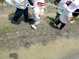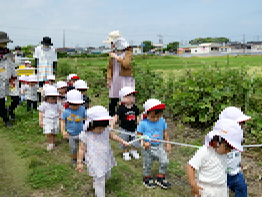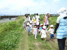 ひよこ組とりす組の子ども達が散歩に出かけました。今日は梅雨の晴れ間で、蒸し蒸しと暑さを感じる陽気でした。子ども達が向かったのは外城田川の方です。保育所横の道ではアスファルトからの照り返しが暑く堤防に付くまでにへたってしまいそうなくらいでした。小さな子ども達にはなおさらのようでした。堤防に着くと、今度は昨日の雨でタイヤの跡に雨水が溜っていました。保育士が優しく「ここは歩いちゃだめよ。」と言って子ども達に注意を促しました。まだよちよち歩きの子ども達ですが、ちゃんと先生の言葉を聴いて一歩一歩慎重に歩いていました。途中、ヘリが飛んでいるのやキノコが生えているのを見つけて、「ヴー」とか「アー」とか言って教えてくれました。帰り道は小学校の方を通って帰りました。子ども達にとってはかなりの距離でしたが、がんばっていくことができました。4月からまだ3ヶ月ですが、子ども達の成長にとても感心しました。