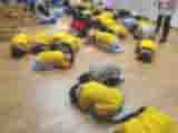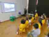 ぱんだ組、きりん組、らいおん組の子ども達が、市役所の危機管理課の方に来ていただいて、防災のお話を聞かせていただきました。今日聞いたお話は、「大雨・台風からの避難」「ハローキティーとまなぼう!ぼうさいくんれん」(DVD)「地震発生時の行動」「むしむし村の防災訓練」(DVD)でした。避難のお話では、保育所の訓練でも使っている、「お・か・し・も」という行動を分かりやすくした合言葉を教えてもらいました。意味は同じですが、保育所では、駆けないの「か」の部分を、走らないの「は」と言っています。他は子どもに聞いてみてください。きっと覚えていると思います。ダンゴムシのポーズもとりました。両手でしっかりと首の頸椎の上をカバーするようにととても丁寧に教えていただきました。11月には地域の方々にもご協力を頂いて避難訓練をします。子ども達も家族も被災しないように祈りますが、いざというときに落ち着いて行動がとれるように今日学んだことを生かして訓練を続けたいと思います。